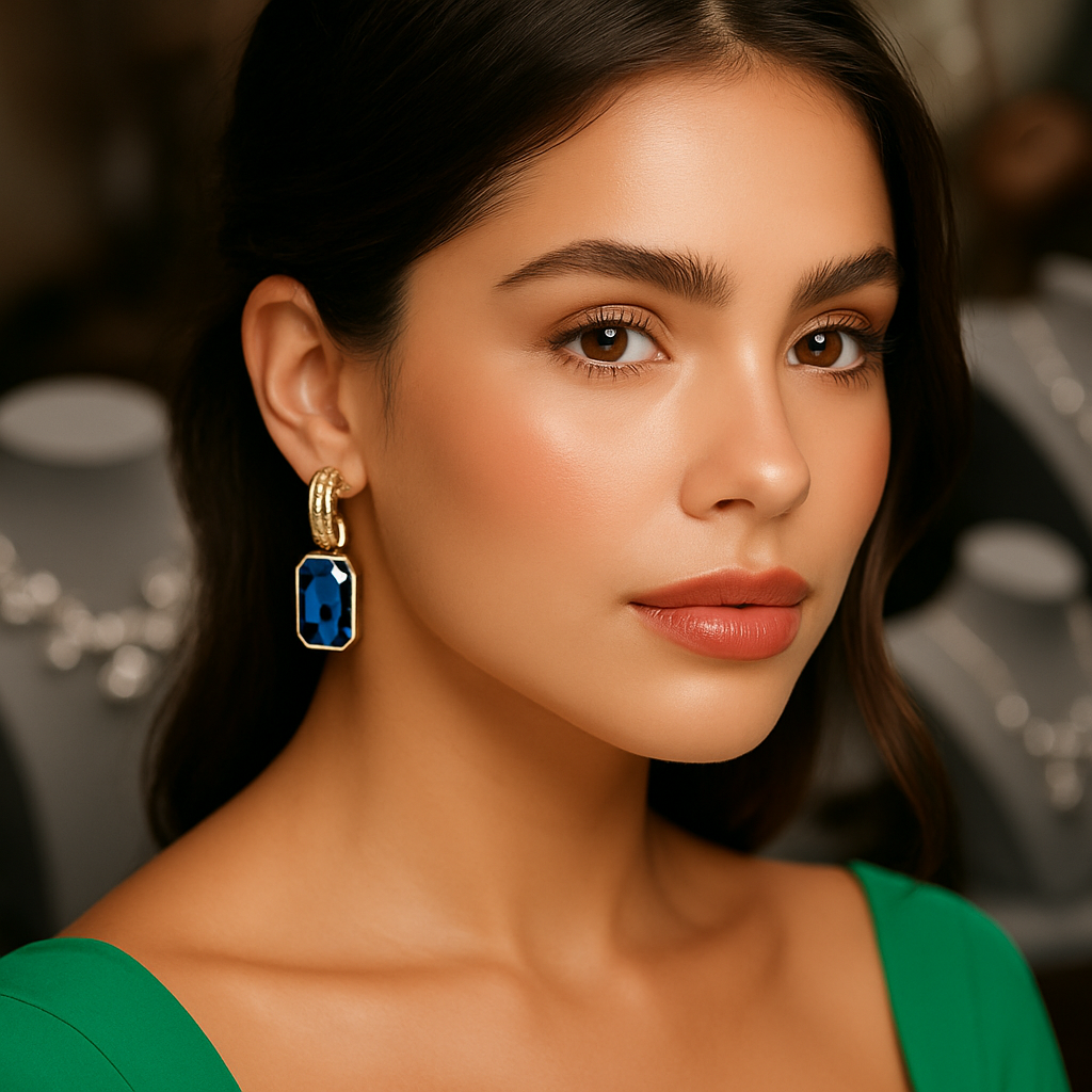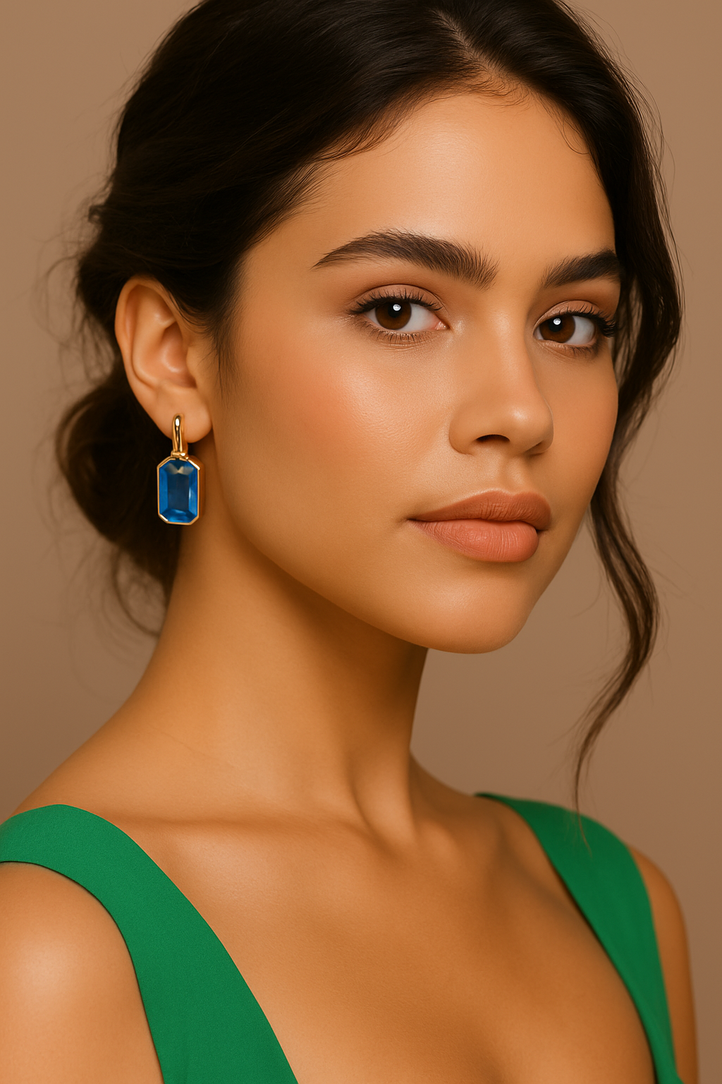Aretes bañados en oro con piedra azul zafiro tallada a precisión. Diseñados para destacar en cualquier ocasión.